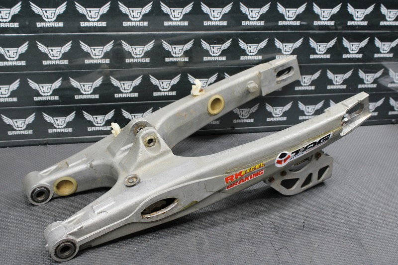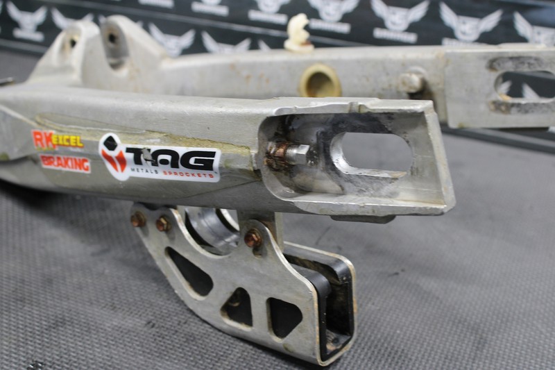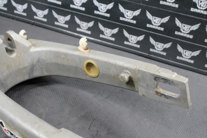 This swingarm is in very good condition and shows normal signs of wear. No cracks, or repairs. Has some chain wear as shown, but has not compromised bearing housing and still seals properly. All threaded holes fully intact. Bearings rotate freely, and feel tight, have some grit, and is recommended they be greased or replaced before installed for optimal performance. Ready to bolt on and ride.