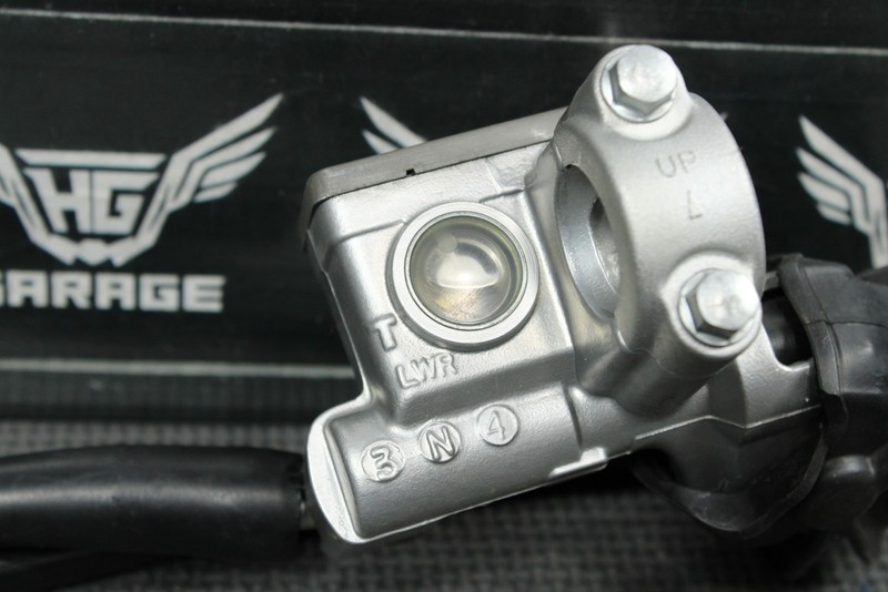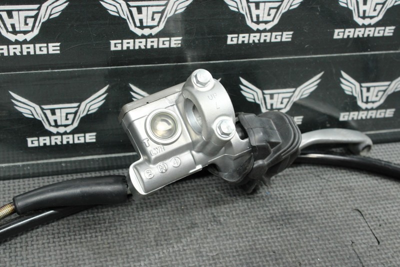 This front caliper is in good condition and shows normal signs of wear. Master cylinder builds pressure, but does not hold, and will need to be rebuilt before installed in order to function properly. Caliper is in great functioning shape, slide pin rubbers freshly greased, no cracks, breaks, or leaks. Overall nice assembly that needs minor work to be functional.