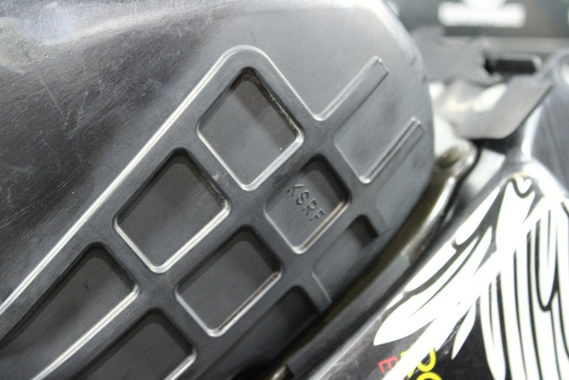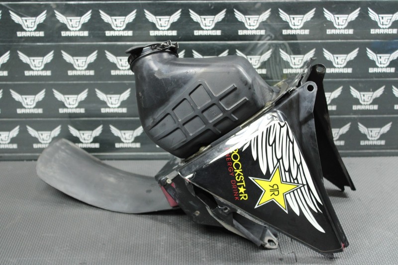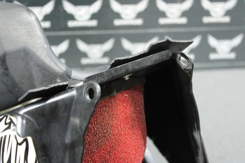 This oem airbox assembly is in good condition and shows normal signs of wear. No cracks, or breaks. 2 rivets have been removed, and replaced with zipties as shown. Recommend rivets be installed before mounted on bike but can be ran as is. Has a small amount of red overspray on the lower part as shown. Overall good functioning shape and was removed from a running riding bike. Ready to install.