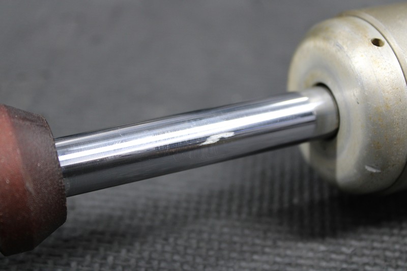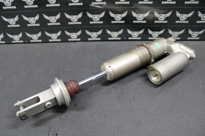This rear shock is in good condition and shows normal signs of wear. Shock does not rebound all the way when compressed, so will need to be serviced. Shock shaft is straight with no corrosion or pitting. Has one very minor scuff, but will not catch on a seal or cause any leaks. Shock body in great shape with no damage. All threads are intact. Good for rebuild.