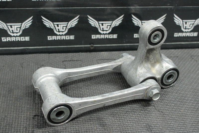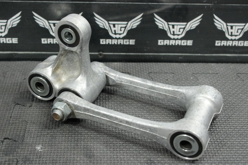 This rear shock linkage is in very good condition and shows normal signs of wear. Nice functioning shape, bearings rotate freely, and feel tight. All hardware in good shape with low wear. Ready to bolt on, and ride.