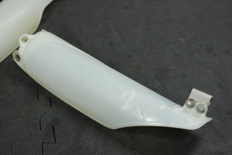 This fork guard set is in good condition and shows normal signs of wear. No cracks, or breaks. Have some minor scuffs, and scratches as shown. Mount as should. Ready to bolt on, and ride.