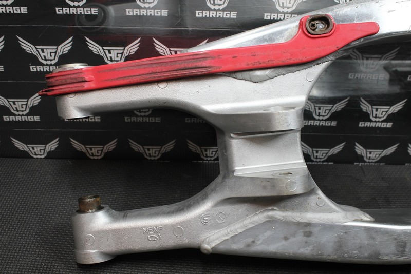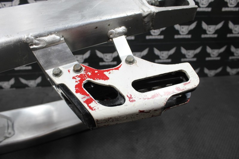 This swingarm is in good condition and shows normal signs of wear. No cracks, welds, or repairs. No excessive chain wear, however is slightly dented inwards on the front left tab where seal sits, did not appear to effect how it seals or functions. Has some scuffs, and scratches from normal wear as shown. Bearings rotate freely, and feel tight, however have a minor amount of grit, and should be regreased, or replaced before installed for optimal performance. Ready to bolt on, and ride.