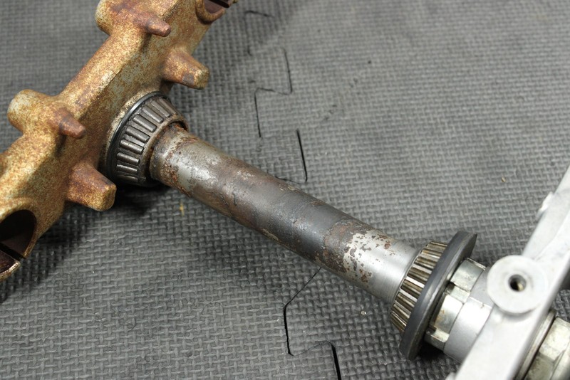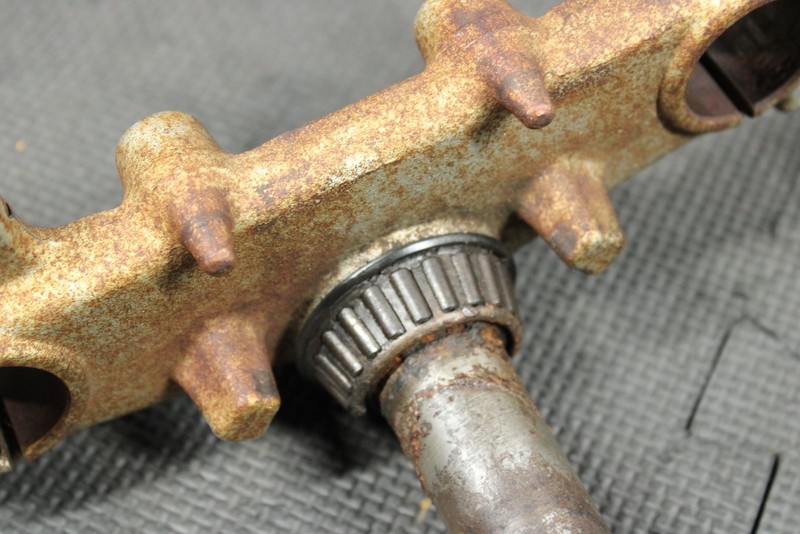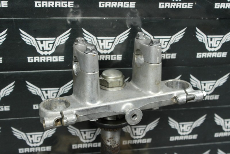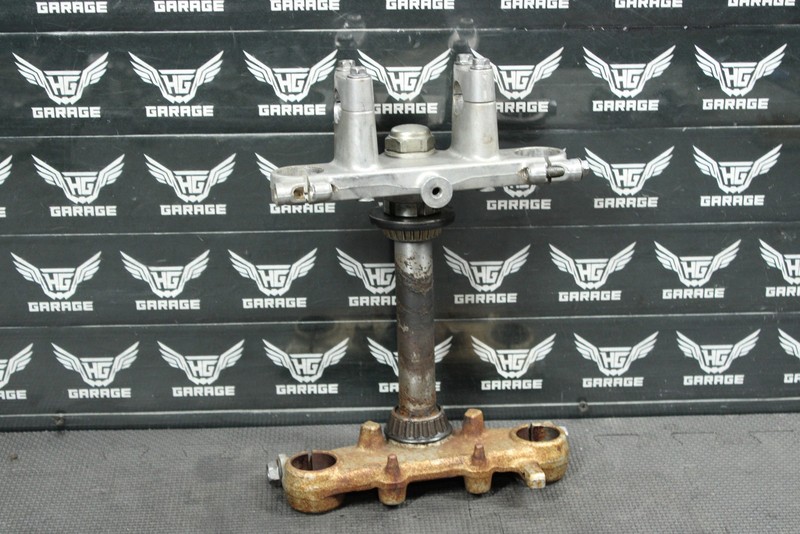 This triple tree set is in very good condition and shows normal signs of wear. No cracks, welds, or repairs. Bearings have some decent wear, and corrosion, and will need to be replaced before installed. All threaded holes intact. Can be ran as is, however is not recommended.
