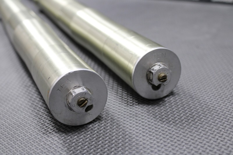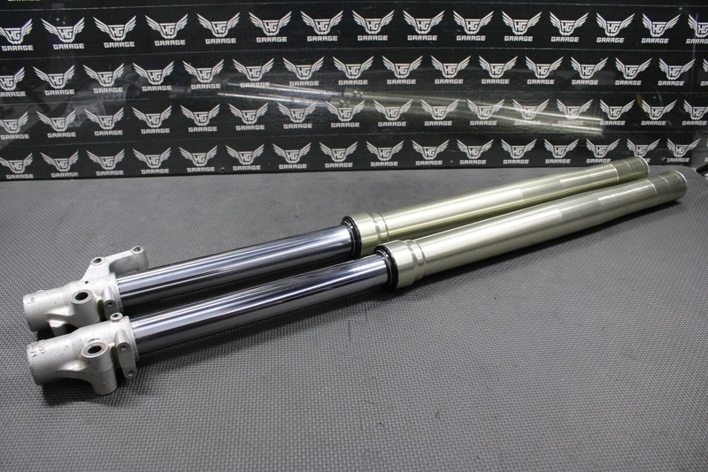 This front fork set is in good cosmetic condition and shows normal signs of wear. Forks cycle smoothly. One side has decent damping and other is pretty springy. Seals are leaking and should be serviced. Cosmetically forks are in nice condition with minor wear. All clickers turn and function. All threaded holes in lugs are intact except for one as shown which is missing the first couple of threads, but does still thread in and torque. Upper and lower tubes in good shape. No pitting or scratches in lowers. Overall solid set of forks that just need to be serviced.