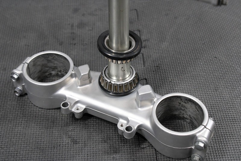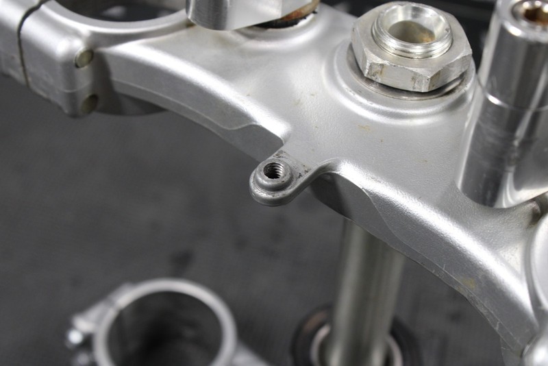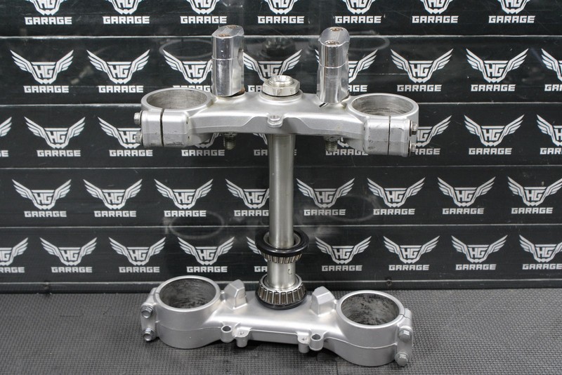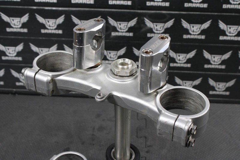 This triple tree set is in very good condition and shows normal signs of wear. No cracks, or breaks. Has Turner Fat bar 1 1/8" clamps installed, rubber bushing have some dryrot, and should be replaced before installed. All threaded holes intact. Bearings felt nice, and rotated freely when installed. Overall good functional triple clamp assembly. Ready to mount.