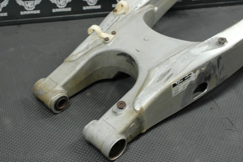 This swingarm is in good condition and shows normal signs of wear. No cracks, welds, or repairs. No excessive chian wear. Bearings will need to be replaced, along with one chain tensioner bolt hole has been poorly drilled out to repair threads, and will need to be drilled, and tapped/helicoiled to restore threads. Cannot be installed as is, and will need work in order to function properly.