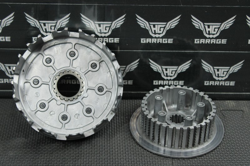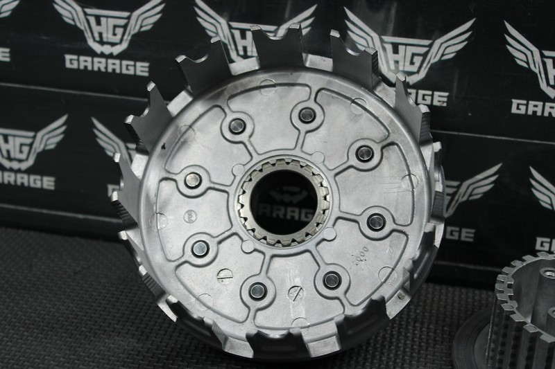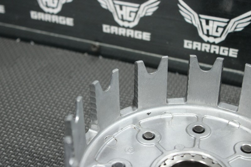 This clutch basket is in pretty good condition and shows normal signs of wear. Basket and hub have some light wear as shown. Has not been filed down. Removed from a good running and shifting bike. All threads are intact.