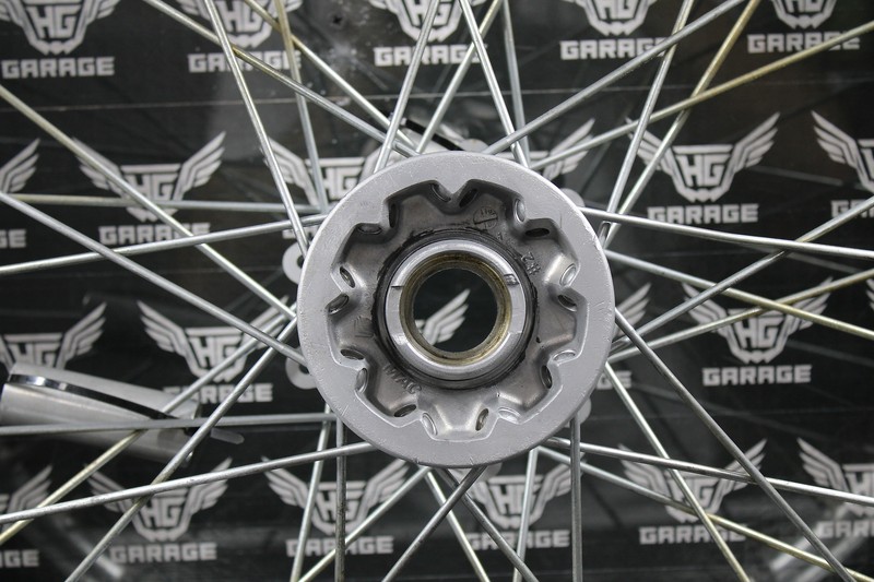 This front wheel is in good condition and shows normal signs of wear. No cracks, bends or issues. Wheel bearings have been removed and are ready for new ones. Tire / tube holds air and is in pretty good shape. Hub has some light wear at the boss for the trip meter mount as shown, but still functions well. Ready to install and run!