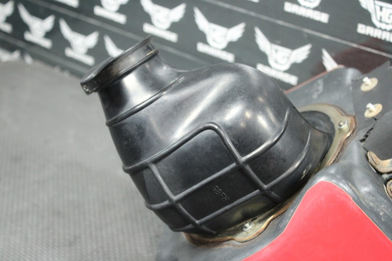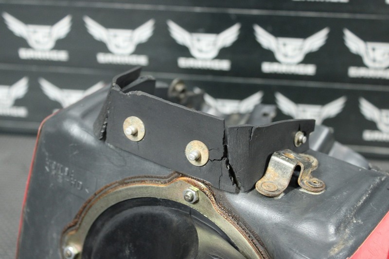This airbox assembly is in good condition and shows normal signs of wear. Missing rear fender riveted tab as shown, and top airbox mounting tab has a bolt sheared off in it, and will need to be extracted in order to restore threads. Still mounts, and funtions as it should. No cracks in intake boot. All other threaded tabs intact. Can be installed as is.