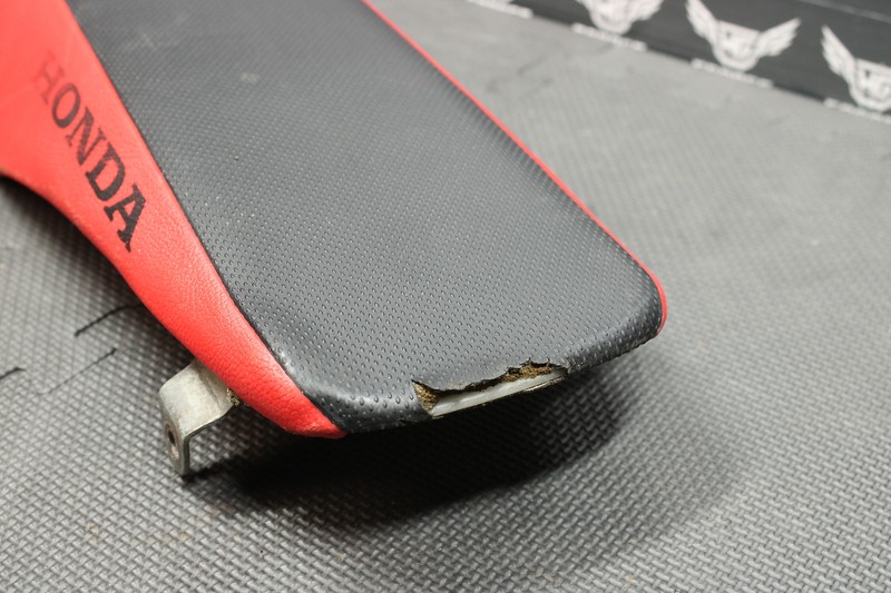 This seat is in very good condition and shows normal signs of wear. Seat cover has a minor small rip/tear in the rear as shown. Seat pan in nice shape, all mounting tabs intact. Ready to bolt on, and ride.