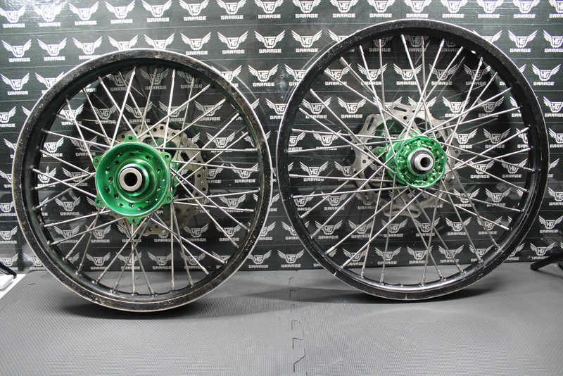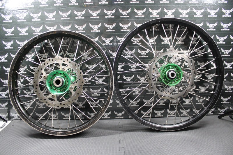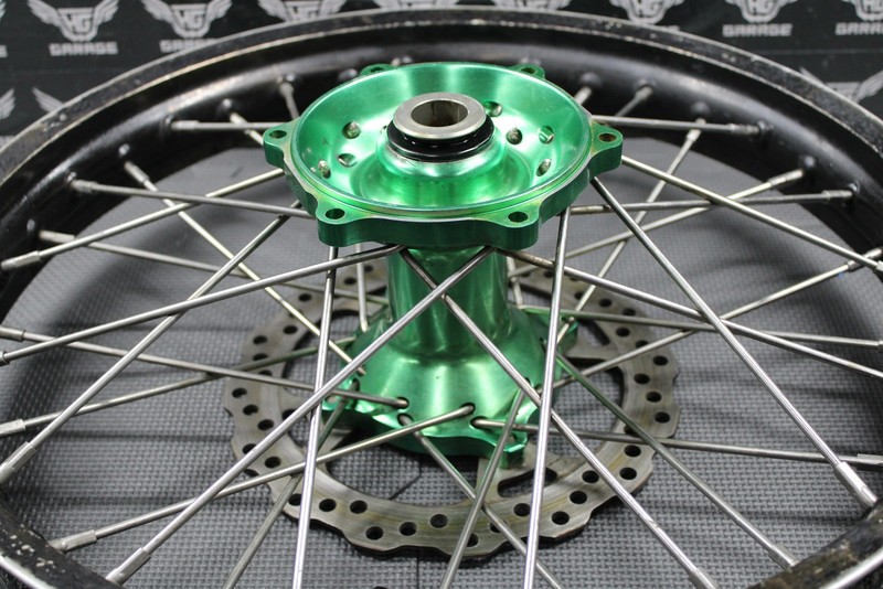 2006 KAWASAKI KX250 2 STROKE DNA RACING FRONT REAR WHEELS WHEELSET RIMS HUBS This DNA Racing black wheelset with green billet hubs is in pretty good condition and shows normal signs of wear. 19 x 2.15" rear wheel and 21 x 1.60" front wheel. Front wheel is pretty true with one ding in the rim. No cracks. Rear wheel has a bit of a wobble, but no cracks or large bends in rim. No damage to either hub. All spokes are tight and intact however, front wheel is missing one spoke. Bearings turn freely. Rims are original black DNA Racing rims, but have been painted over again and some paint is chipping off as shown. Overall pretty solid wheelset removed from a good riding bike. Removed From: 2006 Kawasaki KX250 Please review all pictures to assess the condition of the item. Shipping We ship nearly all orders within 24 hrs and add tracking numbers to eBay as soon as we ship. If you have not received your order by the estimated delivery date, please contact us as soon as possible through eBay messages. Payment We accept all forms of payment that are permitted by eBay. Returns If an incorrect or defective item is received, please contact us as soon as possible through eBay messages so that we can resolve the issue. |