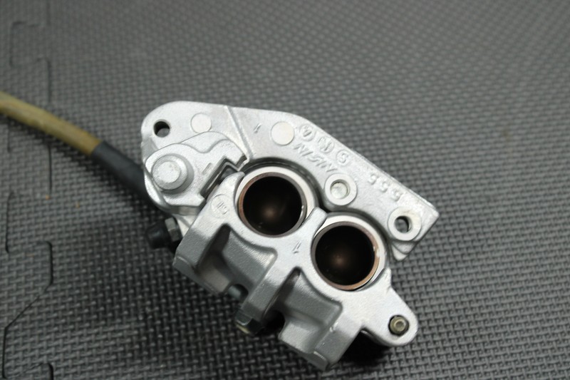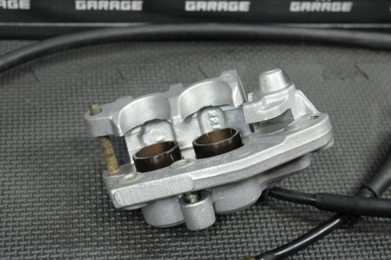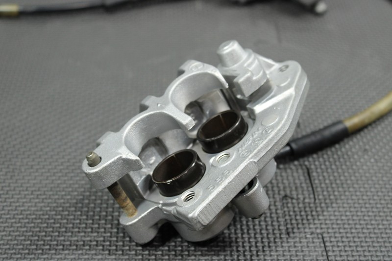 This front caliper is in very good condition and shows normal signs of wear. Brake functions, and builds pressure as it should. Caliper is missing slide pin rubbers, and all hardware/retainers. No brake lever or hardware included. Ready to assemble, and install.