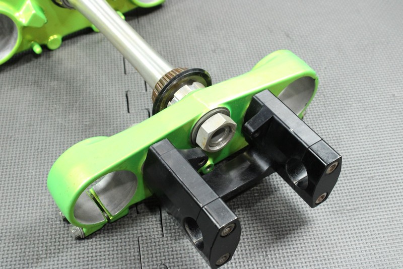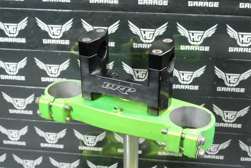 This triple tree set is in very good condition and shows normal signs of wear. No cracks, or breaks. Has been powder coated as shown. All threaded holes intact. Has a nice brp 1 1/8" bar clamps installed with mounts for a steering stabilizer (not included). Bearings have some minor pitting, and should be replaced before installed. However can be ran as is. Ready to mount, and ride.