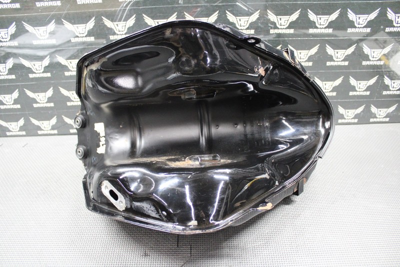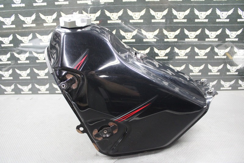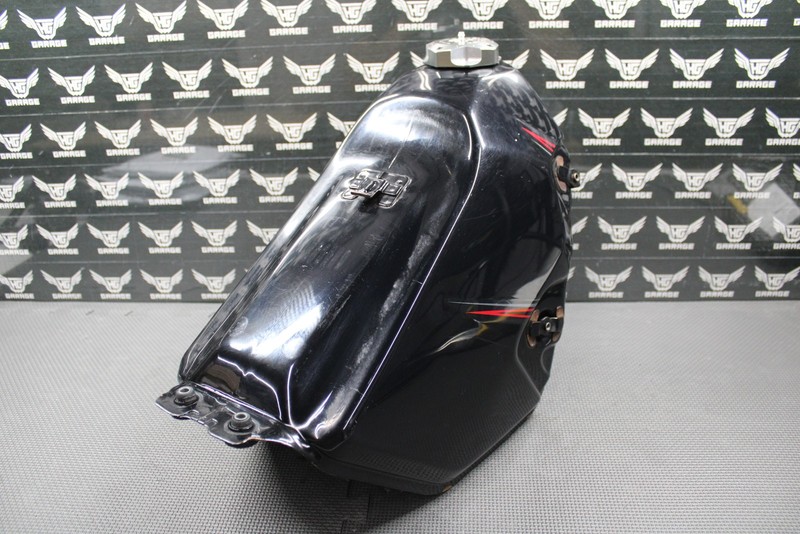 This OEM black metal gas tank is in very good condition and shows normal signs of wear. No cracks, leaks or dents. Nice solid tank in nice condition. Has some light corrosion around some of the mounts as shown (not visible with plastics mounted). No rust inside tank. All mounts and tabs are intact. Paint is in nice shape with good shine and no deep scratches or issues. Zeta billet fuel cap (keyless) installed. Ready to install and run!