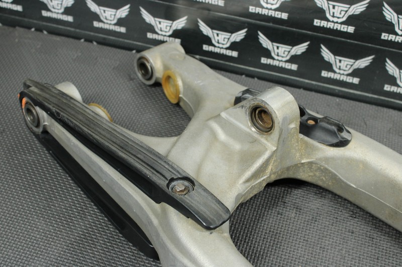 This swingarm is in very good condition and shows normal signs of wear. No cracks, welds, or repairs. No excessive chain wear. Bearings all rotate freely, however rear shock connecting bearing seals are damaged, and is recommended both the bearing, and seal be replaced before installed. All threads intact. Can be ran as is, and is ready to bolt on, and ride.
