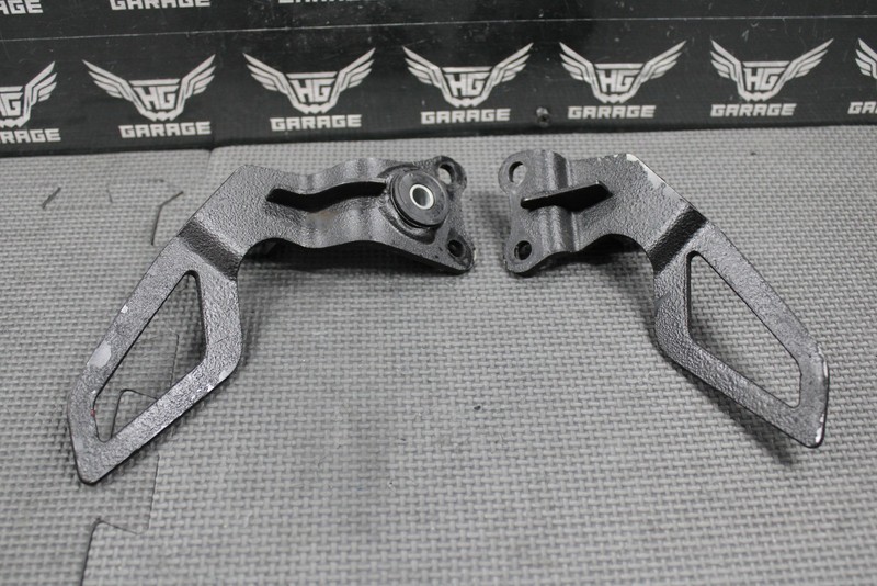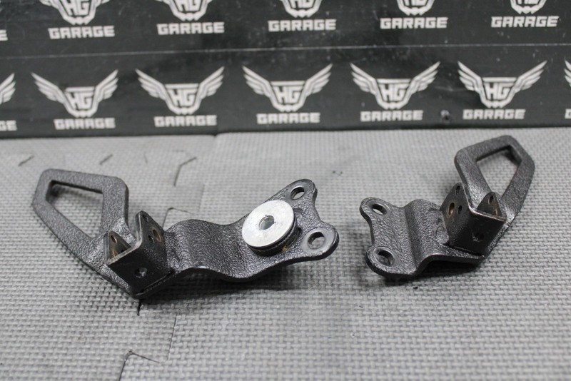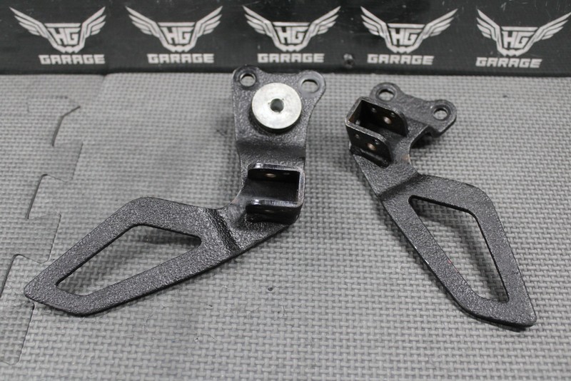 This left and right passenger peg bracket set is in good condition and shows normal signs of wear. No cracks or bends. Brackets mount up and function as they should. Good riding shape.