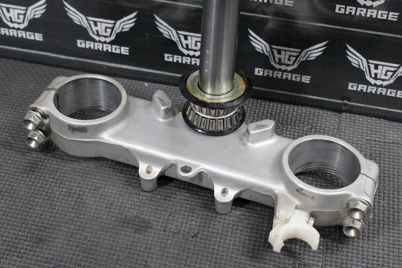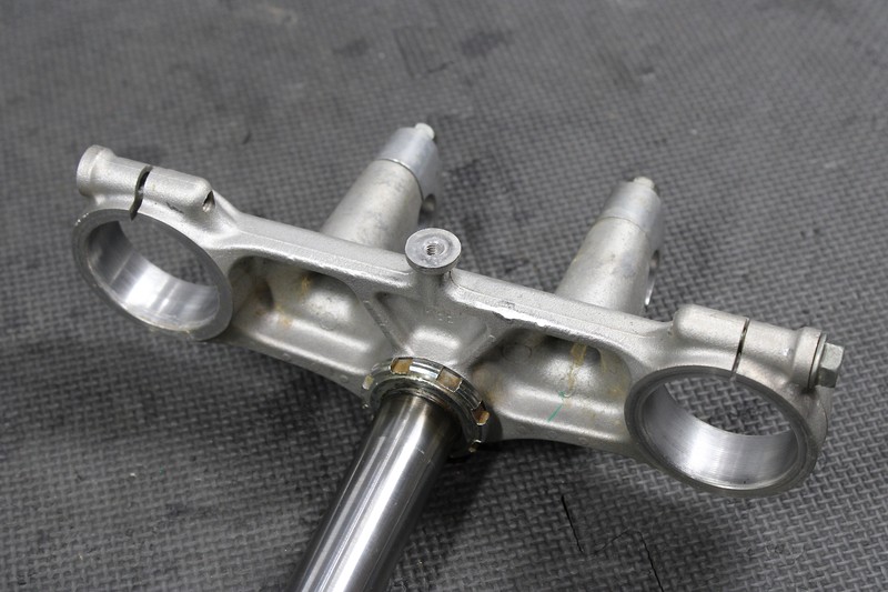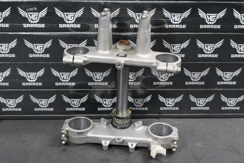 This triple tree set is in very good condition and shows normal signs of wear. No cracks, or repairs. Nice low hour assembly. Missing one hardware bolt for upper clamp as shown. All threaded holes intact. Bearings felt nice when installed with no excessive play. Ready to mount, and ride.