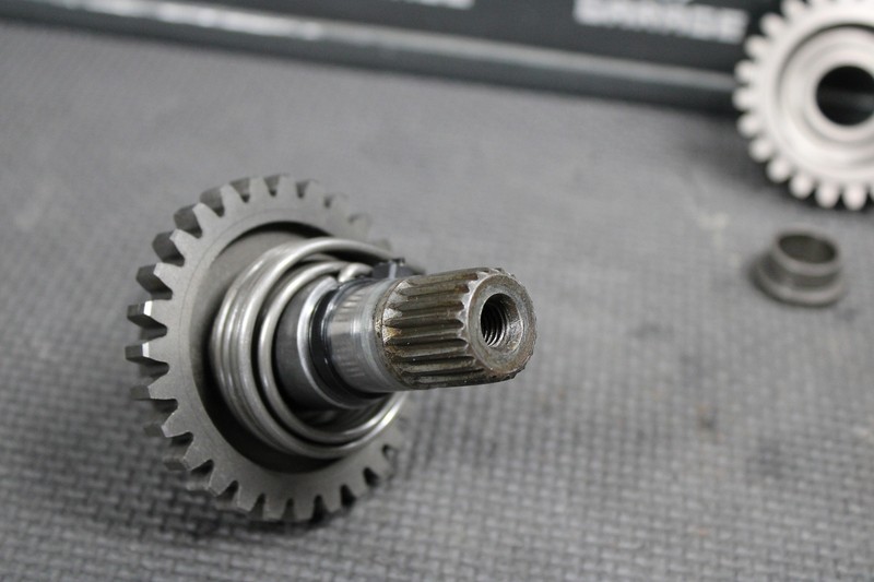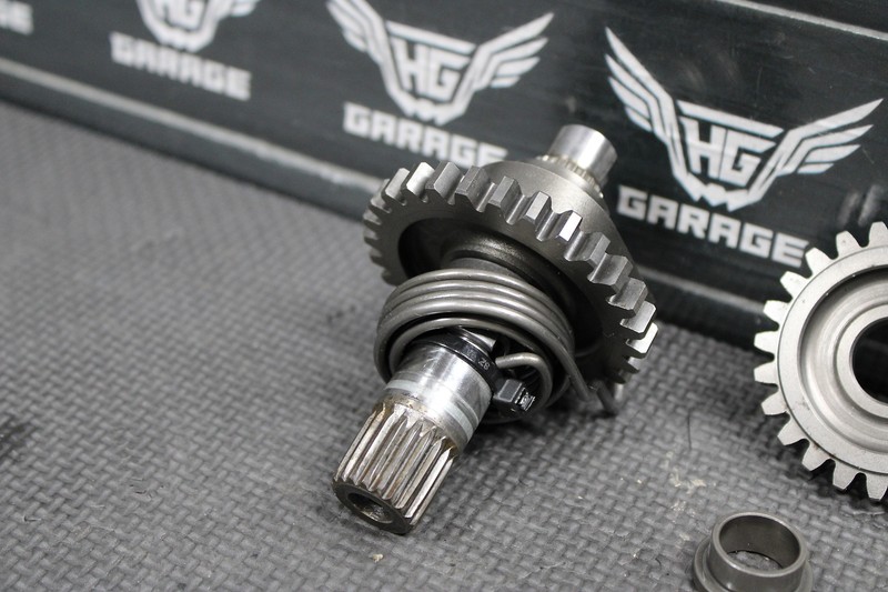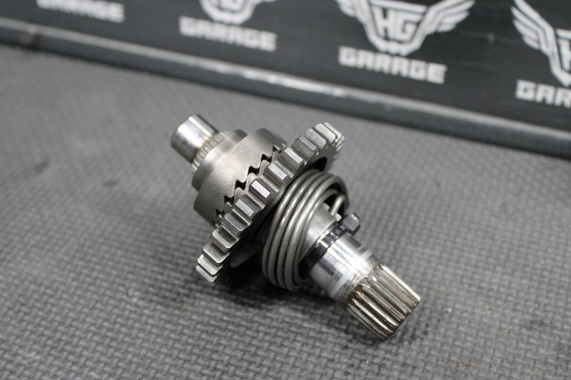 This kickstart gear with shaft is in very good condition and shows normal signs of wear. No cracks, or chipped splines. Missing one thrust washer (90554-728-940) as shown. No cracked, or chipped teeth. Washer will need to be replaced before installed.