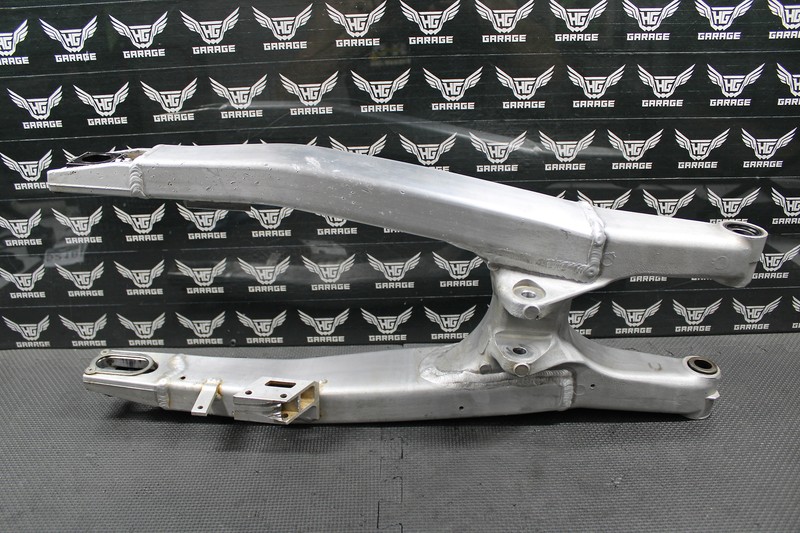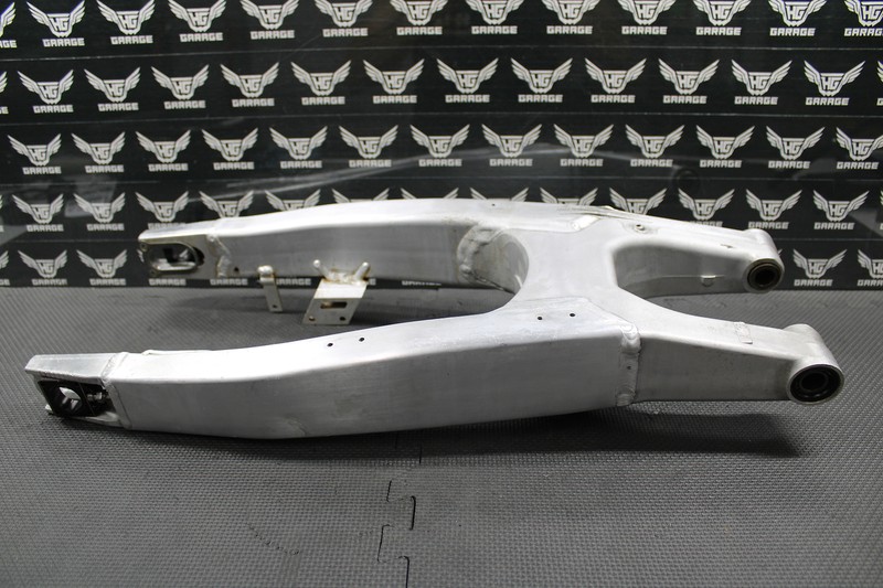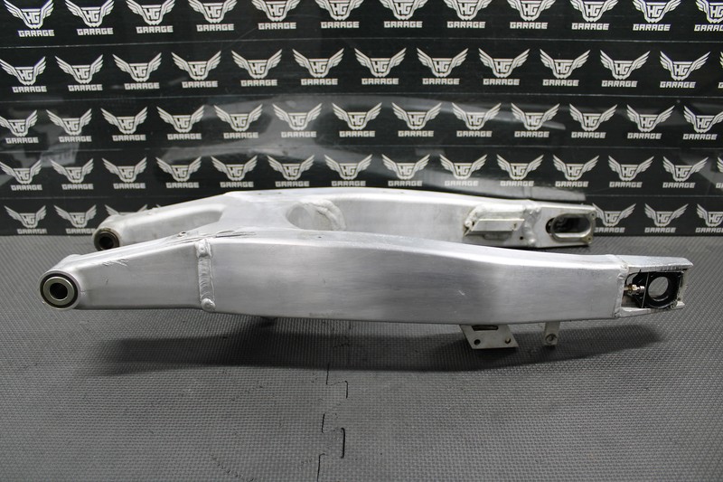 This swingarm is in decent condition and shows normal signs of wear. Has some wear as shown. Bearings turn freely (missing one spacer on the right side). Chain adjusters thread as they should. One dent as shown. No cracks or bends. Overall good riding shape and functions without issue. All bolt holes are intact.