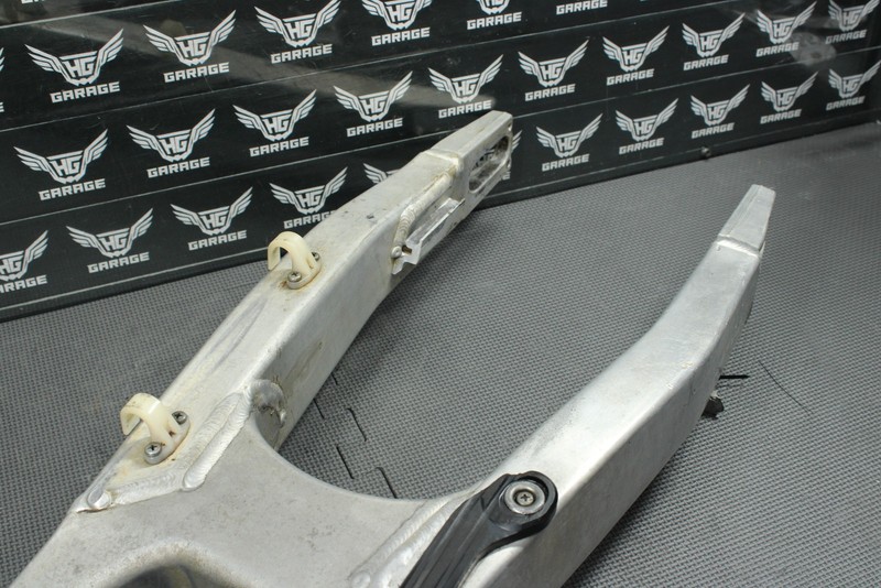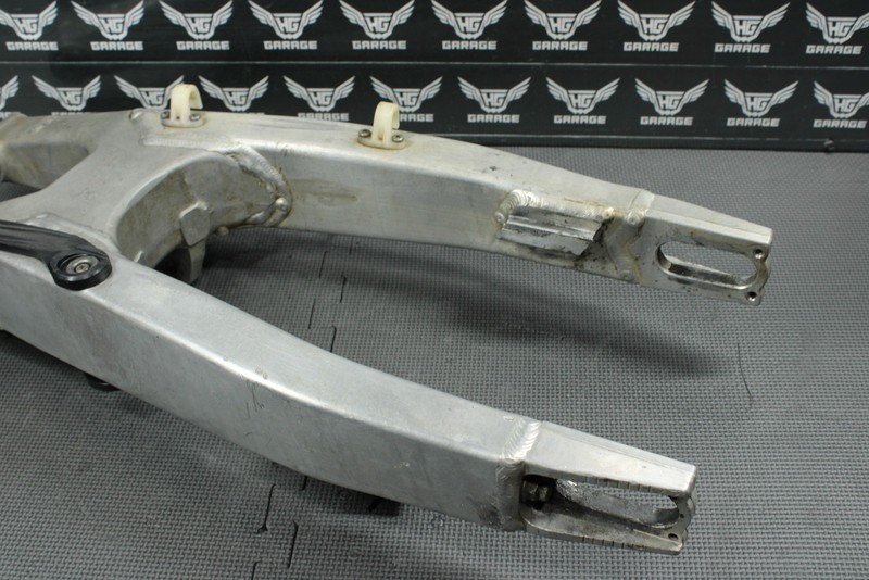 This swingarm is in good condition and shows normal signs of wear. Chain guide mounting tab has broken off as shown, cans till be ran as is, or tab be rewelded back in place. All bearings, and seals will need to be replaced before installed. No excessive chain wear. Cannot be ran as is, and will need work before installed.