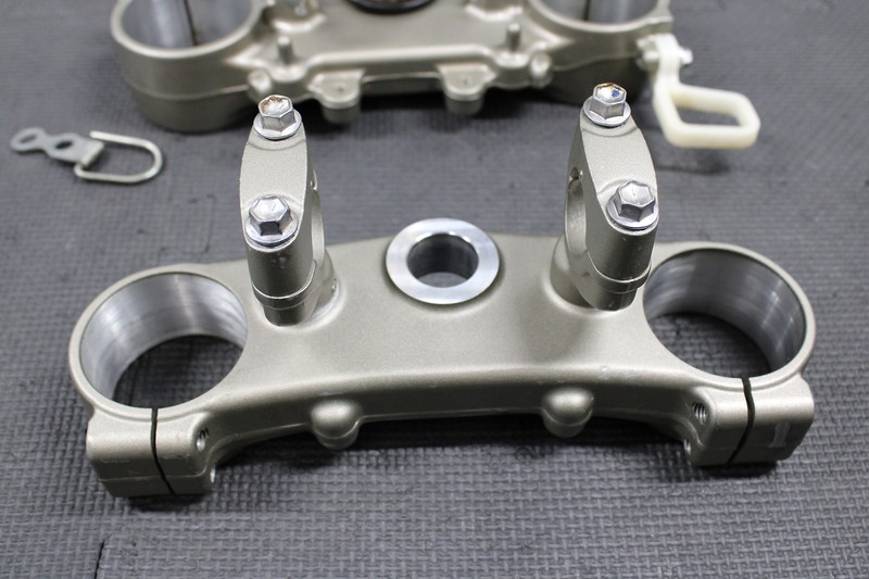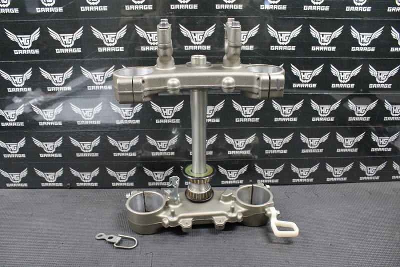 This triple tree set is in great condition with minor wear. No cracks, bends or damage. All threaded holes are intact. Bearings turn freely. Does not come with top nut or top bracket pinch bolts (as shown). Very nice riding shape with no damage. Comes with everything as shown. Ready to mount up and ride!