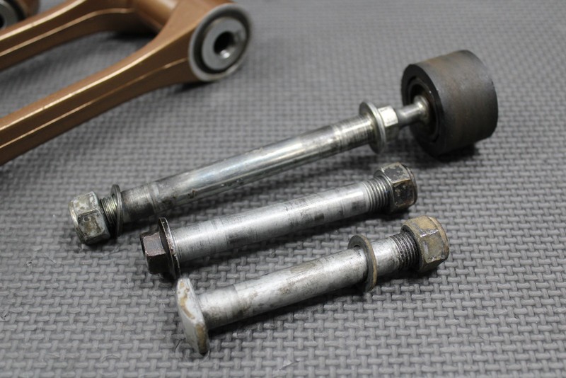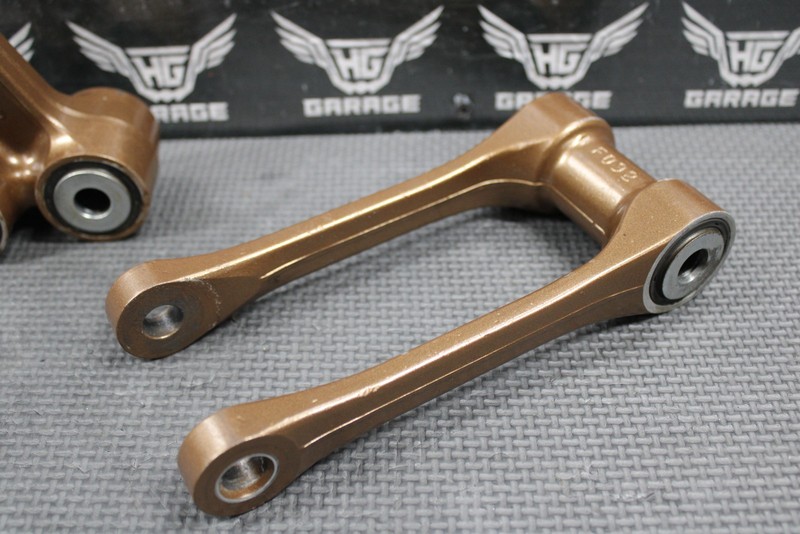 This OEM rear shock linkage is in good condition and shows normal signs of wear. No cracks or bends. Has painted painted bronze and coating is in good shape. All bearings turn freely and have been recently replaced except for the shock mounting eyelet bearing which is fairly seized and will likely need to be replaced. Overall good clean linkage. Comes with bolts as shown.