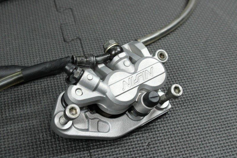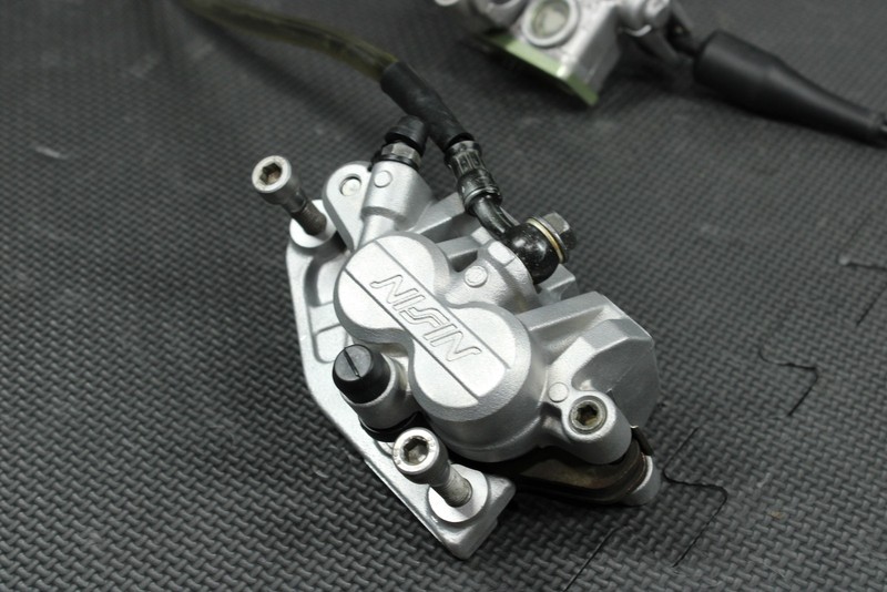 This oem nissin front brake assembly is in very good condition and shows normal signs of wear. No cracks, leaks, or issues. Functions as it should. Nice arc lever installed. Slide pin rubbers intact with no rips or tears. Ready to bolt on.