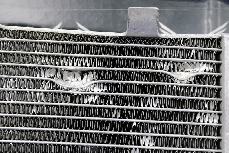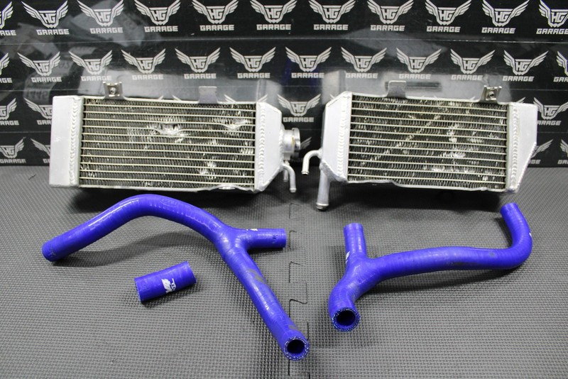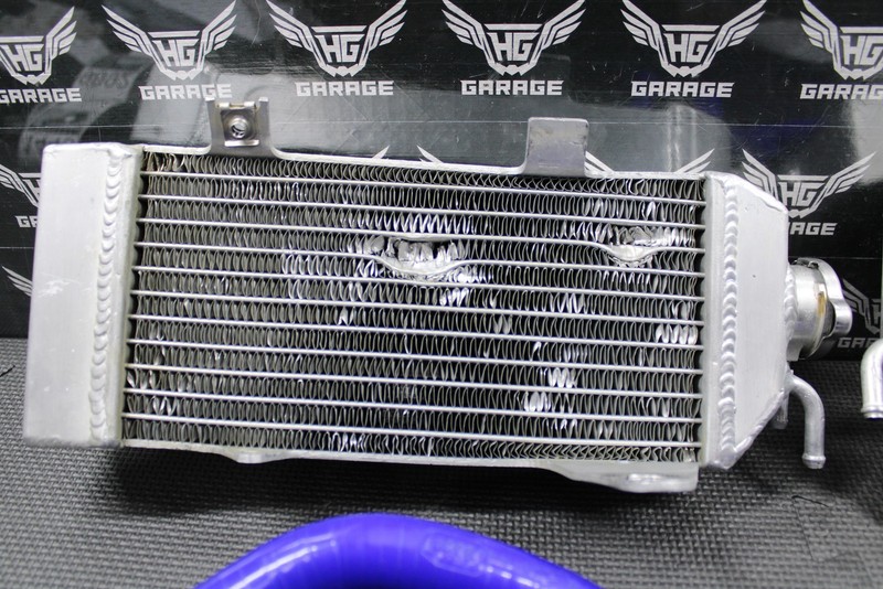 This Mishimoto left and right radiator set with CV4 hoses is in pretty good condition and shows normal signs of wear. No cracks or leaks. Fill side radiator has a couple decent gouges in the fins as shown. Neither radiator leak and have been fully pressure tested. Hoses in good shape with no holes. Both mount up and fit well. Overall good riding shape.