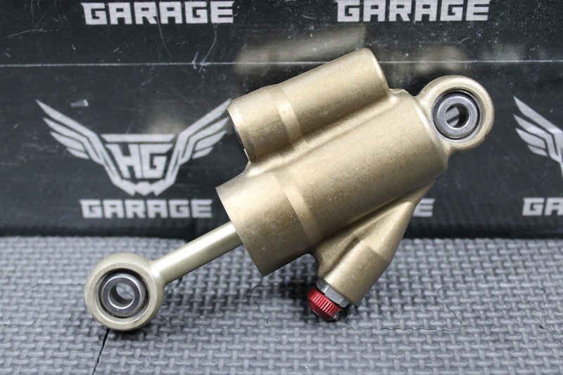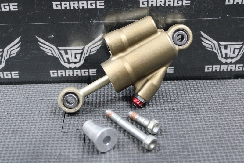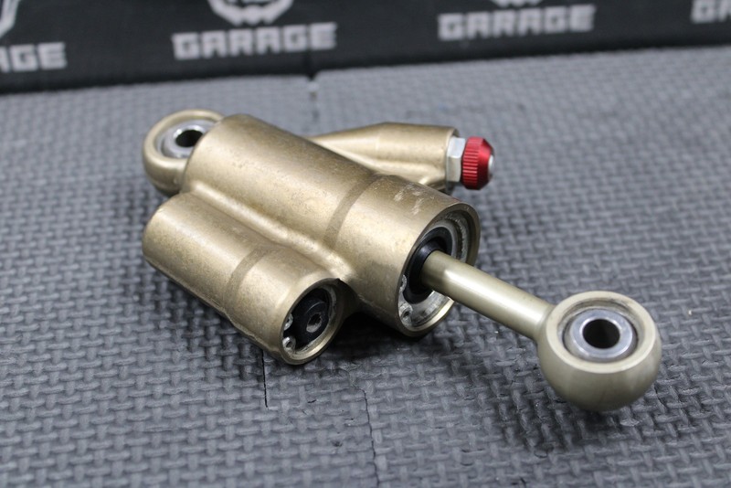 This OEM steering stabilizer / damper is in very good condition and shows normal signs of wear. Good functional shape with no leaks. Clicker functions as it should. No damage to shaft. Actuates smoothly. Has a small rub mark from an aftermarket number plate as shown. No other damage or issues. Ready to install and ride!