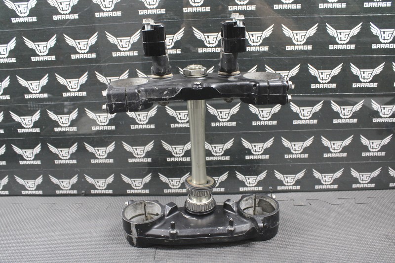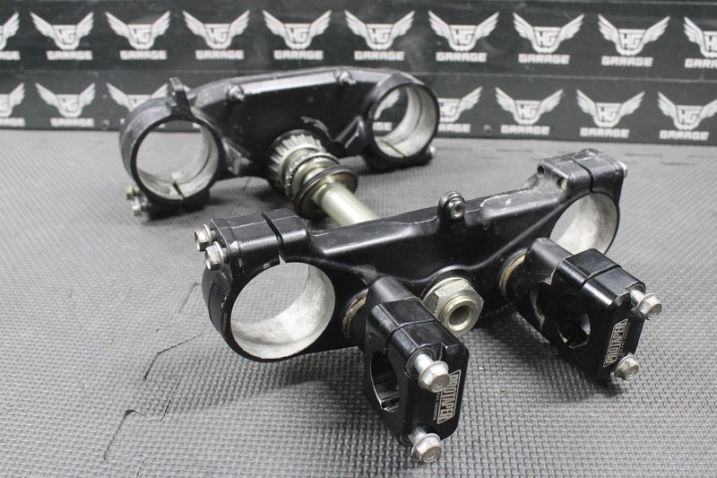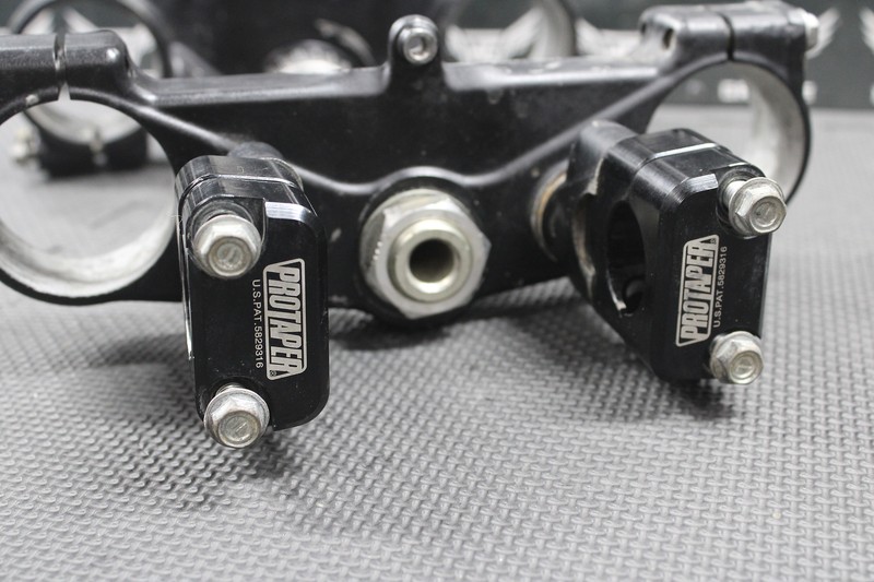 This triple tree set is in good condition and shows normal signs of wear. Nice and straight. Has Pro Taper 1-1/8" fat bar risers installed. All threaded holes are intact. Bearings in good shape and turn freely. Ready to install and ride!