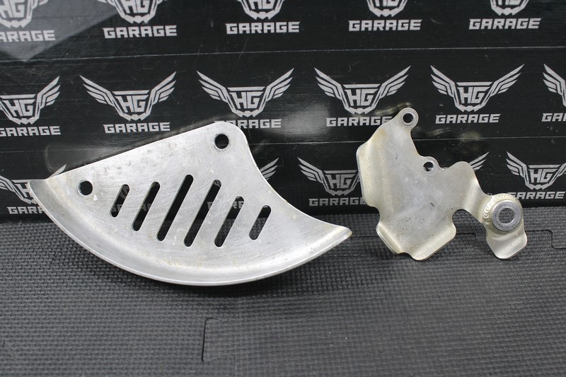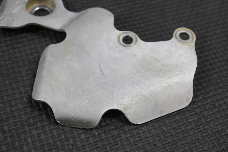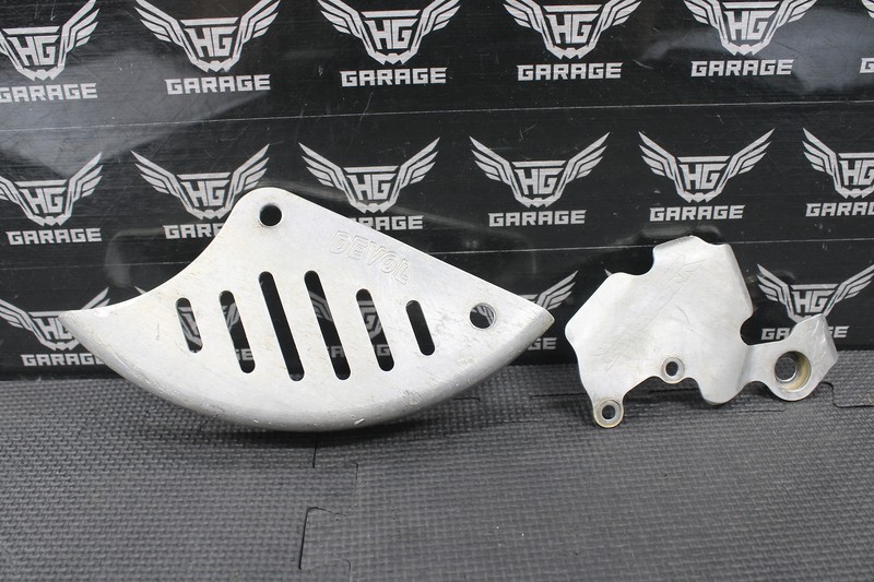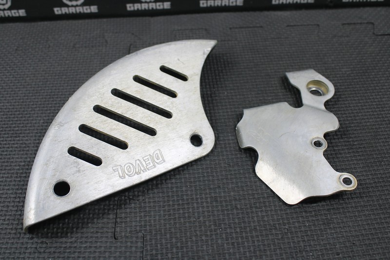 This rear rotor and master cylinder guard set are in good condition and shows normal signs of wear. Devol rotor guard and Works Connection master cylinder guard. No bends or cracks.