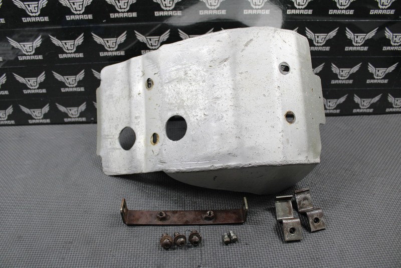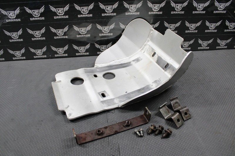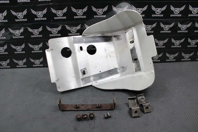 This aluminum skid plate is in good condition and shows normal signs of wear. Mounts up and functions well. Has some dings and dents as shown. Includes all mounting hardware except missing one bolt. Good riding shape.