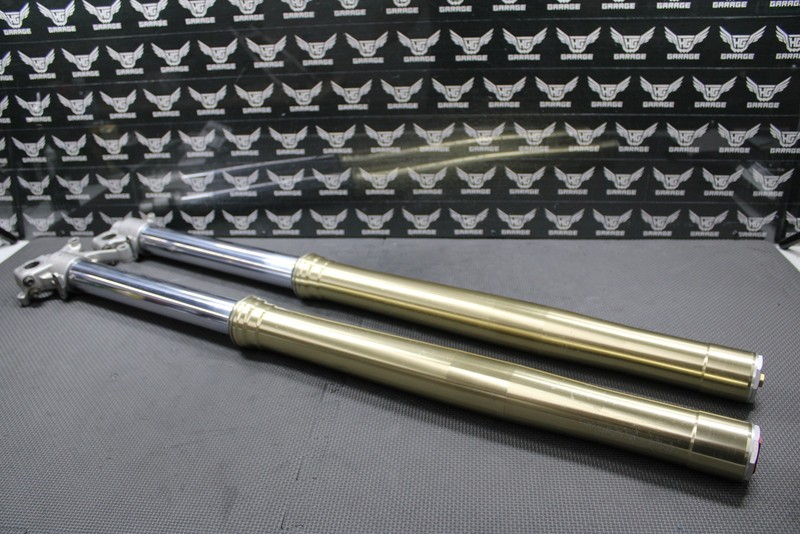 This OEM Showa SFF 48mm front fork set is in good condition and shows normal signs of wear. Forks cycle smoothly and dampning side rebounds fully. Forks are full of oil, and seals are barely starting to weep so will need to be serviced at some point. All clickers turn and function. Lower tubes in good shape with a couple of spots that have been smoothed out. No scratches or pitting that catch a nail. Upper tubes in good shape with no damage, but have some light flaking in the coating in a couple areas. Lugs have some dings and dents. All threaded holes are intact except for the ones shown that are slightly dinged, but should clean up with no issues (threads are intact). Overall nice functional set of forks.