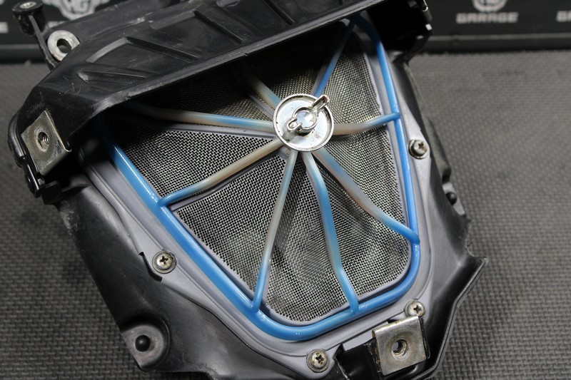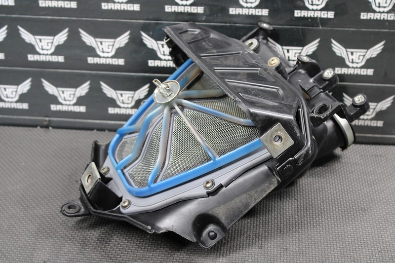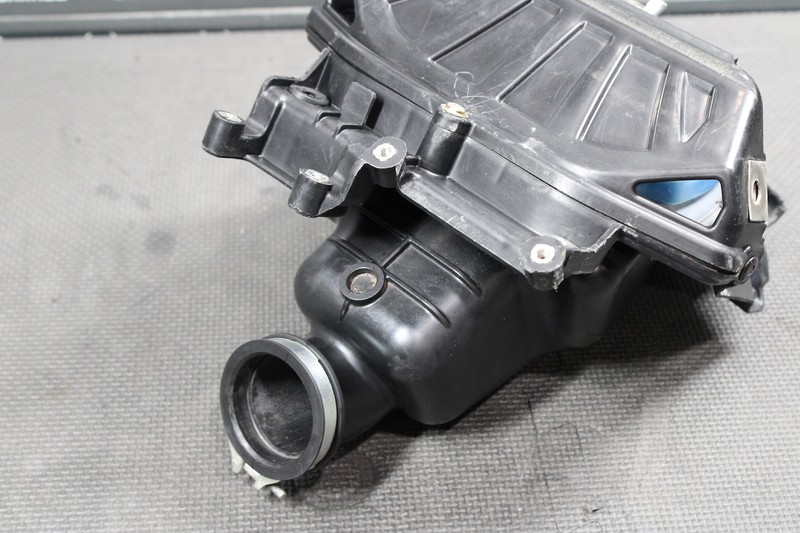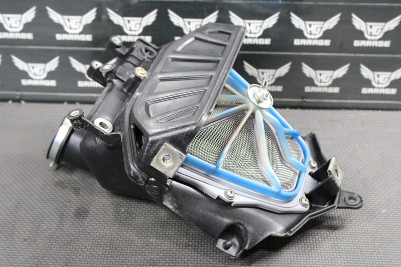 This airbox assembly is in very good condition and shows normal signs of wear. Has one small crack at the top mounting point as shown, but still mounted without issue. No cracks, or repairs seen. All threaded inserts intact and thread as they should. Ready to mount and ride.