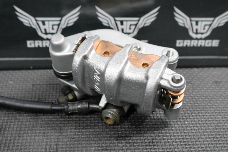 This front caliper is in very good condition and shows normal signs of wear. No cracks, or leaks. Brake builds pressure and functions nicely. Good life left in brake pads. Half of break lever is broken off as shown, but still functions properly. Ready to bolt up and ride.