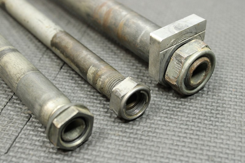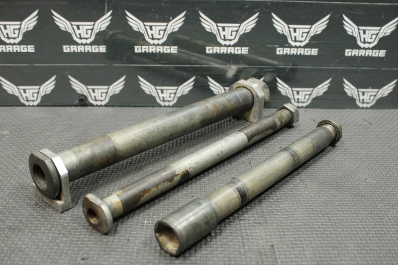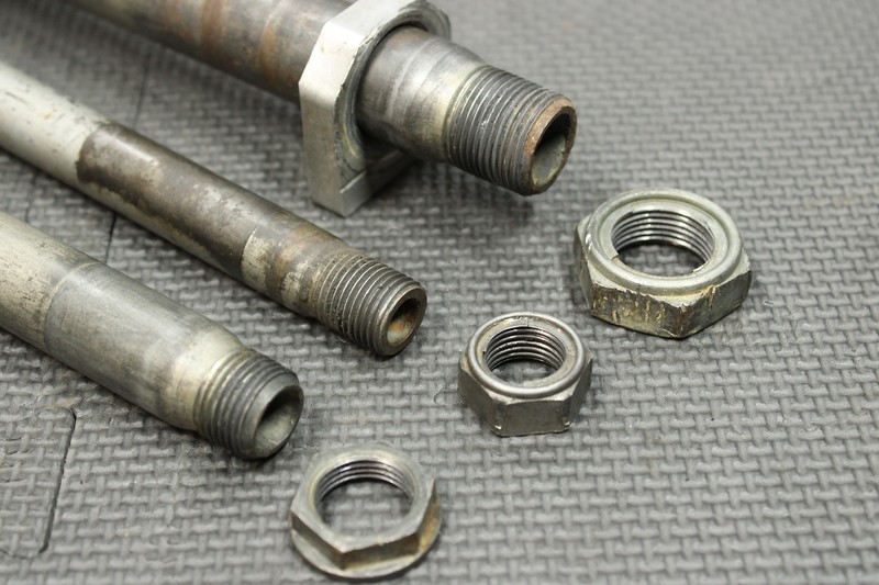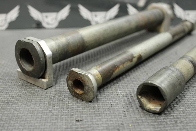 This front/rear axle and swingarm bolt is in very good condition and shows normal signs of wear. All threads in tact. Nuts have some tool marks as shown.
