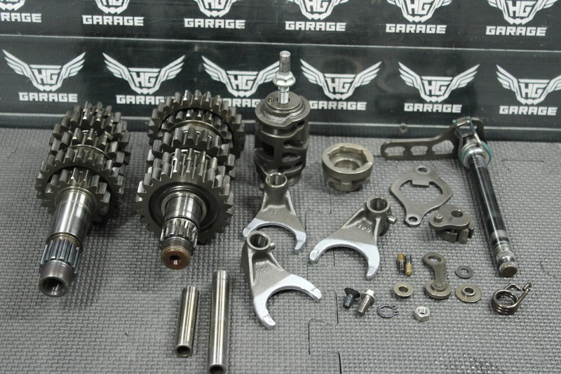 This transmission is in very good condition and shows normal signs of wear. 2nd gear on mainshaft has some decent grind marks as shown, Was removed from a strong running, and shifting bike, however is recommedned it be replaced before installed for optimal performance. No other chipped, or grinded gears seen when inspected. Shift forks, and dogs in good shape. Ready to drop in, and ride.