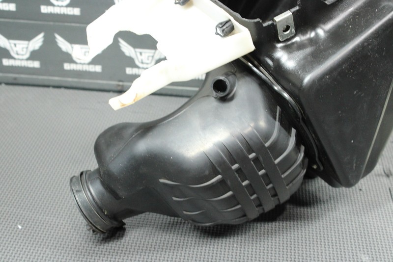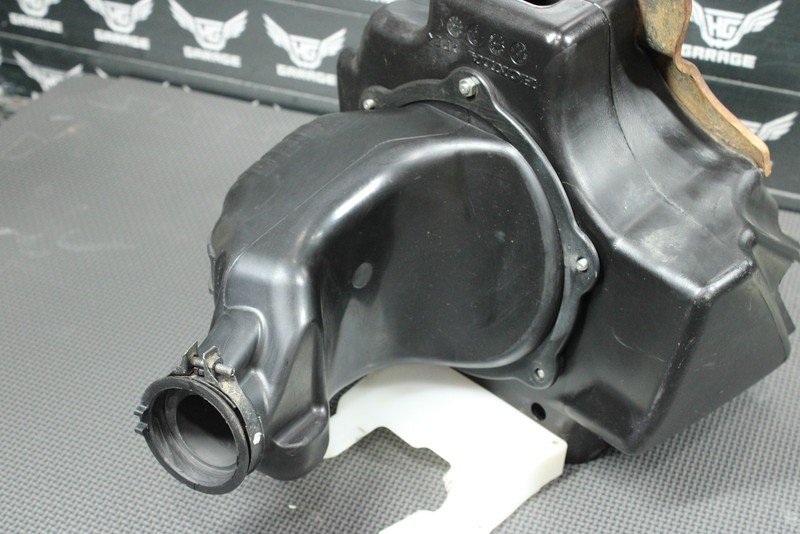 This airbox assembly is in very good condition and shows normal signs of wear. No cracks, or breaks. Missing hardware nuts for intake boot, and element as shown, and will need to be replaced before installed in order to seal properly. All threaded tabs intact. Ready to assemble, and ride.