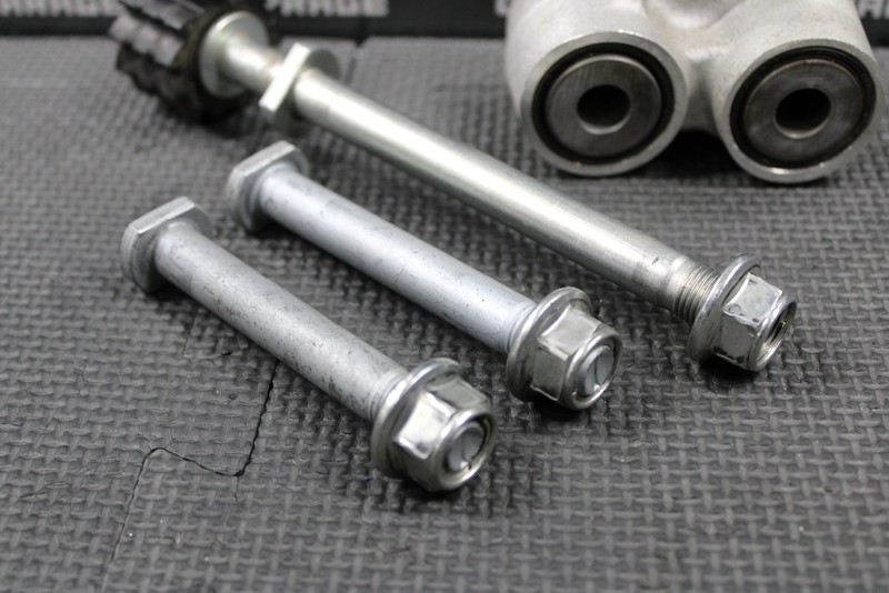 This rear shock linkage is in good condition and shows normal signs of wear. No cracks, bends or damage. All bearings in good shape and turn freely except for the shock mount bearing which is seized up and should be replaced. Overall good condition. Comes with all linkage bolts as shown.
